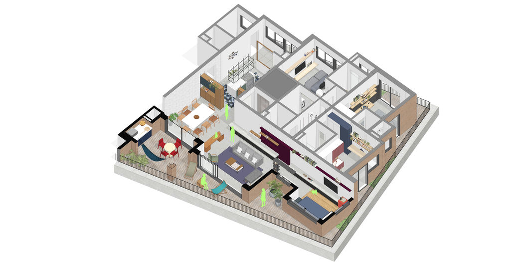 The design was based on four elements: cement, wood, brick, and an extensive color palette. Burnt cement spreads throughout the apartment, forming a concrete countertop that runs through the entire living room to the home theater. Wood was used for the ceiling in the living area and the home theater floor. Brick, already present in the building's facade, was brought inside for the dining room wall. Over 35 colors were used on walls, ceilings, doors, woodwork, and light fixtures.