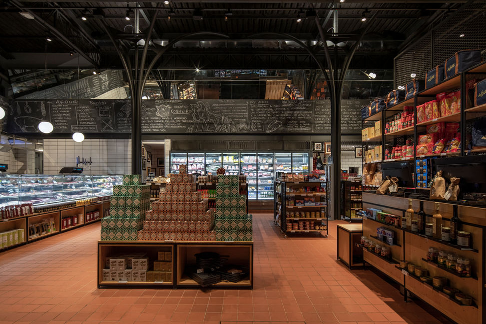 Inside the store, specific areas were designed for bathrooms, a butcher's area, and a kitchen. Opposite the kitchen, the bar counter allows customers to closely observe the preparation of the meats.