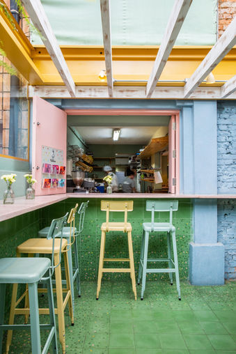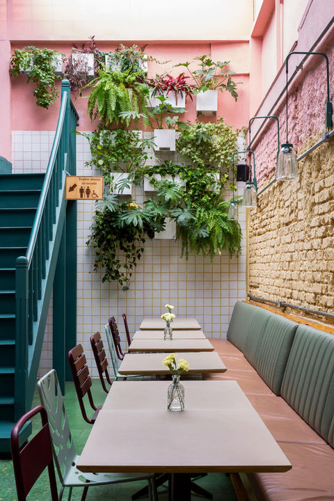 Passando pela “varanda”, existe um corredor com mesas e à esquerda a área da cozinha. Ao fundo, uma área com pé direito duplo e iluminação natural intensa, traz um ar acolhedor que remete à um quintal de casa. Soma-se à esse espaço um paisagismo repaginado e uma parede de azulejos brancos com rejunte colorido que segue a cor do tijolinho pintado na parede ao lado.
