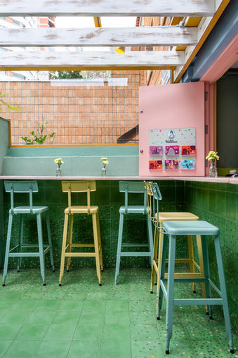 O novo projeto não interferiu na operação e no layout existentes. A prioridade foi a aplicação de novos materiais, cores, mobiliário, paisagismo e luminotécnica. Cores alegres, calmas e claras predominam nos novos ambientes, com destaque para as paredes de tijolinho descascado pintado (originais da casa), para o granilite rosa das bancadas e para o ladrilho hidráulico que cria um degradê no piso e balcão. O ladrilho hidráulico é da coleção “Linha Orgânica”, assinada pelo Superlimão exclusivamente para a Dalle Piagge.