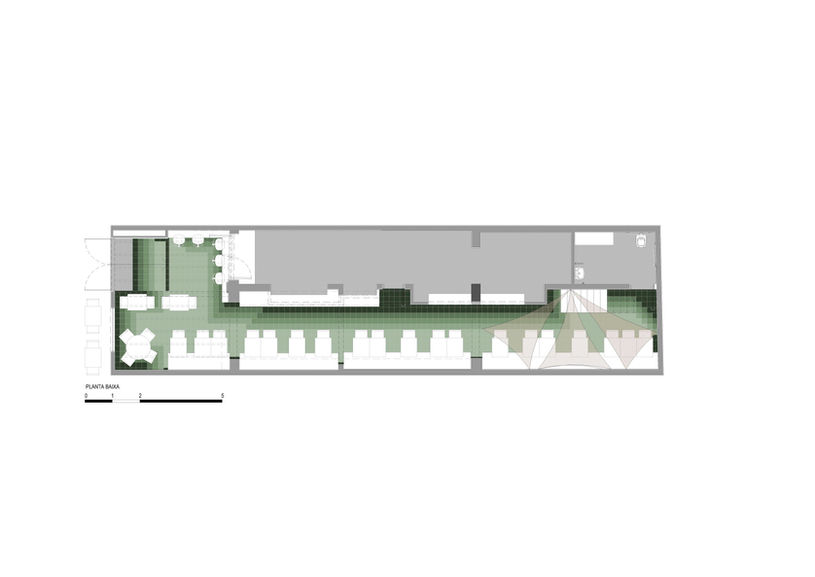 Ao longo da parede do lado direito (oposta à cozinha) há um banco com estofado em couro verde e rose, que segue da varanda até o “quintal” do fundo do lote, possibilitando a junção ou a separação de mesas conforme necessidades do layout.